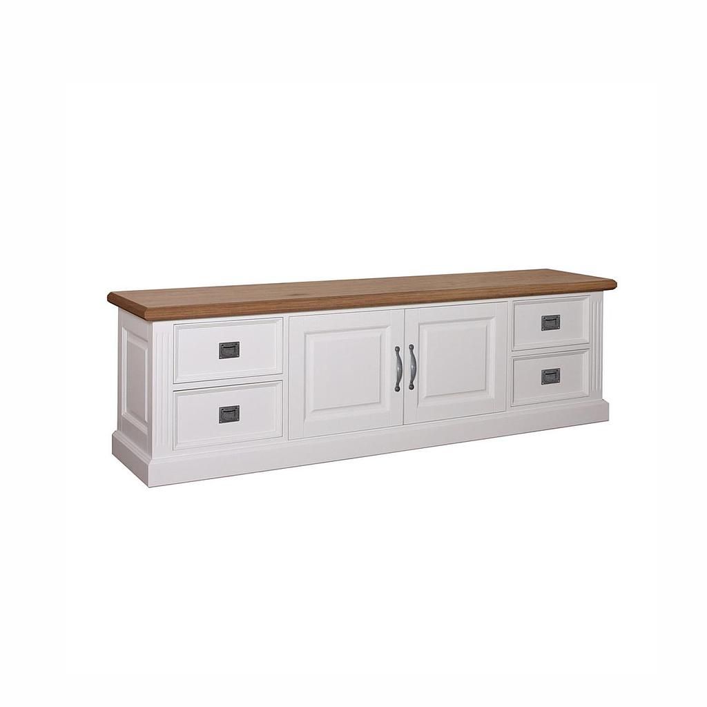 TV-Lowboard im Landhausstil. Zwei Drehtüren mit hochwertigen Scharnieren (Dreidimensional verstellbar). Vier Schubladen auf praktischen Teleskopschienen mit Soft-Close System. Klassische Metallgriffe wahlweise in Farbe Bronze antik oder Nickel antik. Nach alten Vorbildern gefertigt.