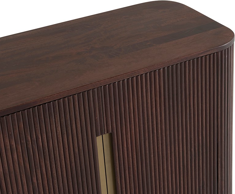 Sideboard, 4-türig. Elegantes Design im Art-Deco-Stil mit vertikalen Linien und abgerundete Ecken. Massives Mango-Holz in einer warmem Walnussfarbe. Das Fußgestell ist passend in "Altmessing" lackiert. Eine aktuelle Formgebung, die an den Retro-Look erinnert und in eine Vielzahl von eleganten "Wohnwelten" passt, von klassisch bis Chic.