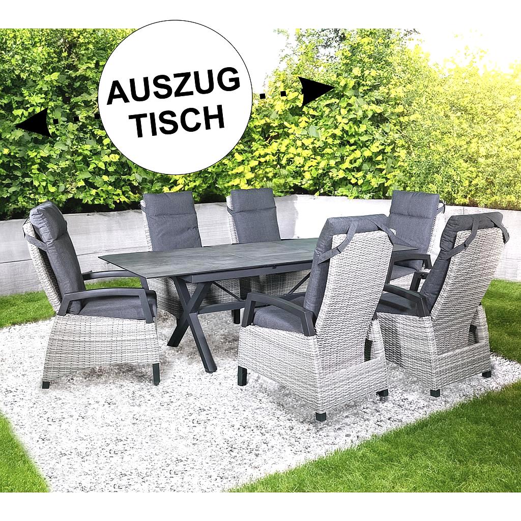 1 Esstisch ausziehbar mit komfortablem Synchron-Auszug. Wetterfeste, original HPL-Tischplatte, Farbe Beton/ Steindekor, grau.